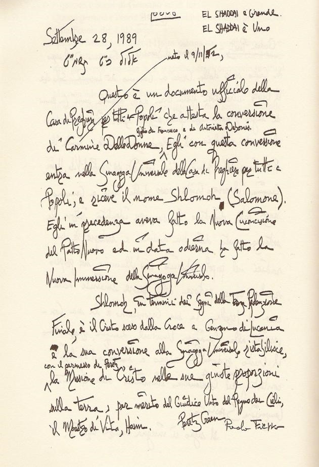Questo è un documento ufficiale della Casa di Preghiera per tutti i popoli che attesta la conversione di Carmine Delle Donne nato il 9/11/1952, figlio di Francesco e di Antonietta De Bonis. Egli con questa conversione entra nella Sinagoga Universale della Casa di Preghiera per tutti i popoli, e riceve il nome Shlomoh (Salomone). Egli in precedenza aveva fatto la nuova circoncisione del Patto Nuovo ed in data odierna ha fatto la Nuova Immersione della Sinagoga Universale. Shlomoh, in termini dei Segni della Terza Redenzione Finale, è il Cristo sceso dalla croce a Genzano di Lucania e la sua conversione alla Sinagoga Universale ristabilisce, con il permesso di Peretz, la Missione di Cristo nelle sue giuste proporzioni sulla terra, per merito del Giudice Unto del Regno dei Cieli, il Maestro di Vita Haim.